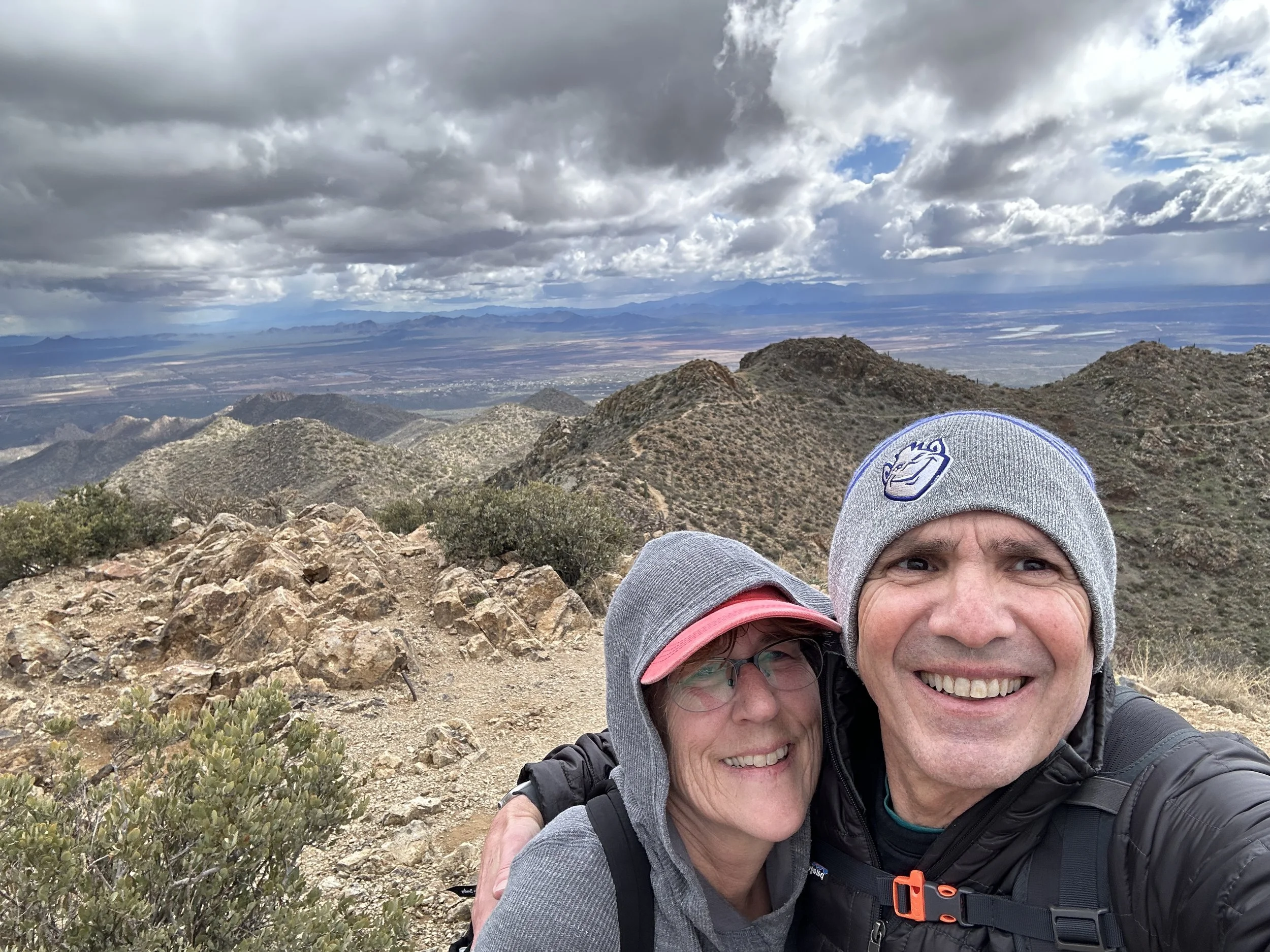 A few minutes into the hike, the trail drops into a wash and splits. As we stayed right on the trail and continued a challenging ascent, one of the most impressive saguaro’s seems to pop out and knowing that its probably over 150 years old makes it even more beautiful. About half way to the top we intersected with the Sweetwater Trail. Its an open area and the wind really picked up. The final couple miles were moderately difficult, but the wind picked up continually as a storm was blowing in. The storm was on the other side of the mountain so we did not see it until we got to the top. We signed the summit registration book and took a few pictures. The wind was super strong with the storm, we were not able to spend much time at the top. On the way down we were rained on and hailed on (pee size). It was a super fun hike and the views from the top of Wasson Peak were amazing. We captured pictures from the summit including the storm and posted those below.